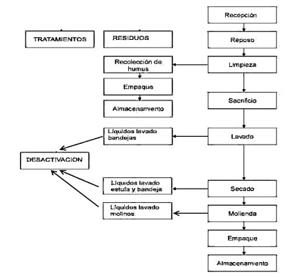 4. Dada la contaminación ambiental que pueden producir los residuales líquidos del proceso de fabricación de la harina de lombriz y para eliminar la contaminación del manto acuífero producida por las aguas de desecho domésticas y las aguas de desecho del proceso, es necesario someterlas a desactivación antes de incorporarlas a corrientes de agua.