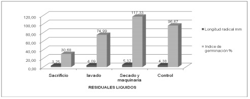El largo de la raíz tuvo diferencias al compararlo con el control en los distintos tipos de aguas residuales. Se evidenciaron diferencias significativas (p < 0,05) entre el agua de sacrificio y el control, así como al compararlo con los demás residuales. En general no hubo diferencias significativas (p < 0,05) entre el control y el agua de lavado.