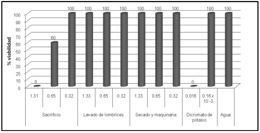 Como compuesto químico en el control positivo de toxicidad se utilizó dicromato de potasio, se estableció de acuerdo a la metodología de la literatura, un valor de 0,016 mg/cm2, siendo este el punto de partida como valor máximo de toxicidad aguda, el control negativo de la prueba fue con agua destilada y por último como control de calidad se estipuló que la mortalidad en los controles debe ser inferior al 10 % de la toma de muestra. La viabilidad se tomó como medida de manifestación de los modelos biológicos seleccionados a la acción toxica de los efectos del contaminante en escala porcentual del 0 (cero) al 100 (cien). [11].