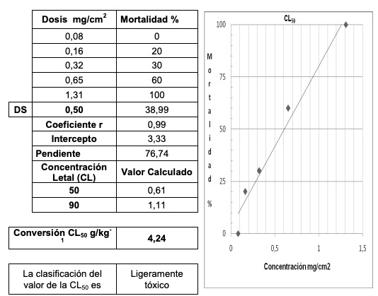 El cálculo de la CL50, complementa el ensayo de toxicidad realizado por contacto en papel de filtro húmedo pues ayuda a establecer la dosis máxima en mg/cm2,la CL50, se define como la concentración, obtenida por estadística, de una sustancia de la que puede esperarse que produzca la muerte, durante la exposición o en un plazo definido después de ésta, del 50 % de los animales expuestos a dicha sustancia durante un periodo determinado [1]. De tal manera que, la mitad de la muestra de población (50 %) de una prueba en un animal o especie vegetal específico en un período determinado muere a causa de la exposición a través de la inhalación, respiración o algún otro mecanismo de interacción con el medio. Como una comparación de toxicidad, los valores de LC50 no tienen correlación directa de una especie a la otra o a los seres humanos. La medición CL50 se hace en microgramos o miligramos de material por litro, o partes por millón (ppm), de aire o agua. Cuanto menor sea la cantidad, más tóxico es el material. También conocida como la concentración letal media o concentración crítica de la población 50 [1].