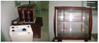 El dispositivo funcionó bajo las siguientes condiciones: onda trapezoidal, conexión de bobinas en paralelo y frecuencia de 60 Hz. El instrumento utilizado para las mediciones de la inducción magnética fue un gaussímetro de efecto Hall de la marca LakeShore, modelo 410, (la inducción electromagnética fue medida en Gauss (G) a 22°C) y el dispositivo fue caracterizado midiendo la intensidad del campo magnético en el punto exacto donde se coloca la muestra, lo que permite conocer el valor aproximado de dicho campo en el área de trabajo experimental. La instalación de muestra a continuación en la figura 1. Ver a continuación la figura 2.