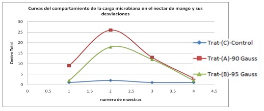 En la figura 4, se muestran las curvas del comportamiento de la carga microbiana en el néctar de mango y sus desviaciones, para los tres casos experimentales.