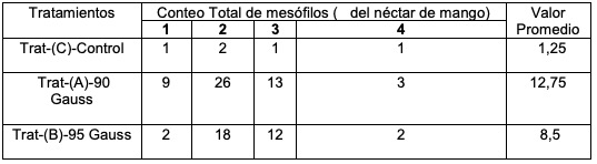 1. Aplicar el tratamiento electromagnético con valores de 90 y 95 G provoca una estimulación en los valores del conteo total de mesófilos, propiciando un aumento de la carga microbiana presente en el néctar de mango objeto de estudio.