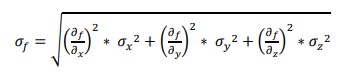 Hay una clase de magnitudes que no se pueden obtener por medición directa y que requieren de la aplicación de la teoría de propagación de errores. El cálculo del error de una magnitud derivada a partir de los errores de las magnitudes medidas, con las cuales está relacionada a través de una determinada expresión matemática se realiza mediante la propagación de errores que consiste en determinar el error de la magnitud f que está relacionada con varias magnitudes (por ejemplo x, y, z,…) por medio de una función genérica. Las magnitudes x, y, z,… han sido medidas y se conoce sus valores medios y sus errores. La expresión que da el error de f es: