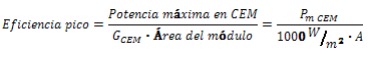 Uno de los parámetros más importantes en el diseño y cálculo de la instalación fotovoltaica es la potencia pico, Pm CEM, que se define como la potencia máxima del módulo en condiciones estándar de medida (CEM), definidas como temperatura del módulo 25 °C, irradiancia solar GCEM=1000 W/m. y distribución espectral correspondiente a una masa de aire AM 1,5G. Al conocer esta potencia y el área del módulo ., se puede hallar la eficiencia pico, ηpico,o eficiencia del módulo en CEM.