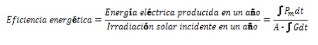 También hay que conocer el rendimiento energético del módulo en función del lugar de instalación y de las condiciones climáticas a las que va a estar expuesto. Para esto se emplea la eficiencia energética, ηenergética, que es la energía total producida por el módulo fotovoltaico en relación con la energía solar que incide en él, durante un periodo de tiempo dado.