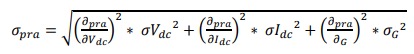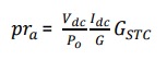 (31)La expresión que precede al radical depende de los valores medidos de Vdc, Idc y G, así como de los parámetros conocidos: potencia pico de la instalación e irradiancia en condiciones estándar de medida GSTC. El resultado de esa expresión sería el valor del pr instantáneo del arreglo fotovoltaico, calculado a partir de las mediciones. Por tanto, el error de medición del pra es aproximadamente el 5 % del valor medido indirectamente: