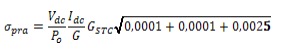 (30)Luego de calcular las derivadas parciales de la ecuación 30 a partir de la ecuación 29 y aplicar lo establecido en la norma UNE-EN 61724 respecto a la precisión exigida en la medición de voltaje dc y corriente dc (1 % de la lectura en ambos casos) e irradiancia (5% de la lectura), se obtiene: