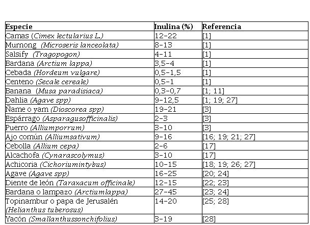 Se han identificado alrededor de 36 000 especies vegetales que poseen cierto contenido de inulina, entre las plantas más representativas que producen fructanos se identifican las del grupo Liliaceae (ajo, cebolla espárrago, ajo porro) y Compositae (achicoria, pataca o tupinambo y yacon). Las especies con mayor contenido de inulina la almacenan en la parte subterránea de la planta. Otras especies (por ejemplo, en la familia Gramineae) presentan altos contenidos de fructanos en sus partes aéreas, pero con bajo rendimiento de extracción a nivel industrial. Se ha producido inulina en menor escala por medios microbianos orientados a la conversión enzimática de hongos [16]. En la tabla 1 se presenta el contenido aproximado de inulina en algunas plantas referido a producto fresco.