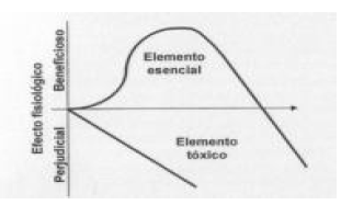 La figura 1 muestra cómo se comporta un elemento esencial y uno tóxico. Frente al esencial el organismo responde positivamente hasta alcanzar un valor crítico, a partir del cual no cambia su respuesta durante un pequeño intervalo de crecimiento de la dosis y luego comienza a responder negativamente considerándose tóxico al igual que el otro.