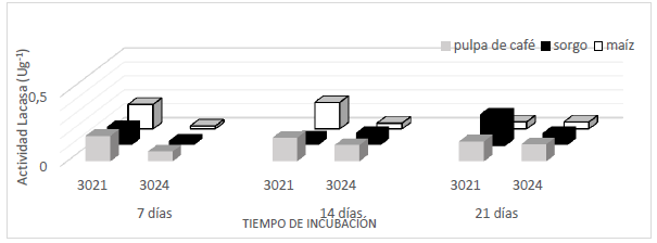 Al realizar la comparación estadística (figura 1), se observa que la producción de lacasa es superior para todos los tiempos de incubación con la CCEBI 3021, excepto para el sorgo a los 14 días de incubación, donde es mayor para la CCEBI 3024.