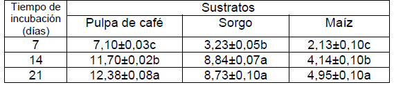 Se presentan los valores promedios de tres réplicas ± la desviación estándar. Letras iguales para un mismo sustrato, refiere no existencia de diferencias estadísticas significativas entre las medias de los tiempos de incubación. (α=0.05)