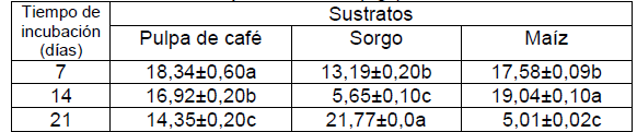 En la tabla 1 se muestran las actividades enzimáticas con los diferentes sustratos para la cepa CCEBI 3024. Para cada sustrato hay diferencias significativas para cada tiempo de incubación, sin embargo con la pulpa de café se alcanzan los mayores valores, luego le sigue el sorgo y el de menor valor es el maíz. Este comportamiento es esperado, pues la composición del sorgo y el maíz, a pesar de ser semejantes, en el sorgo hay presencia de polifenoles, al igual que en la pulpa de café que también los contiene /11, 12/.