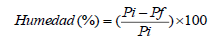 Se determinó la humedad por el método gravimétrico. Para esto se pesó en balanza digital “Sartorius”, modelo “CP224S con cápsula tarada una muestra de 5,0 g de biomasa y se mantuvo en la estufa a 100°C por 24 h, la cápsula se enfrió en una desecadora hasta la temperatura ambiente y se pesó nuevamente, procedimiento que fue repetido hasta obtener una pesada constante. Los valores de peso inicial y final de la biomasa fueron usados para determinar la humedad (1).