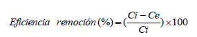 La eficiencia de remoción de níquel de la solución inicial y la capacidad de adsorción de níquel de la biomasa fueron calculadas a través de un balance de masas según se refiere en la literatura haciendo uso de las ecuaciones 2 y 3 [5, 7].