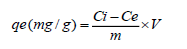qe es la capacidad de adsorción de la biomasa en el equilibrio expresada en (mg/g), m es la masa de bioadsorbente usado (biomasa, expresada en g) y V es el volumen de la solución en (L)