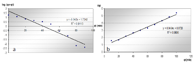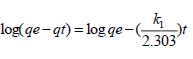 qe y qt representan la cantidad de níquel adsorbido por la biomasa en el equilibrio y al tiempo t respectivamente, k1 (1/min) es la constante de la razón de adsorción de pseudo-primer orden y se calculó a partir de la pendiente de la recta de mejor ajuste a los datos experimentales, los que fueron representados en un gráfico de log(qe-qt) contra t.