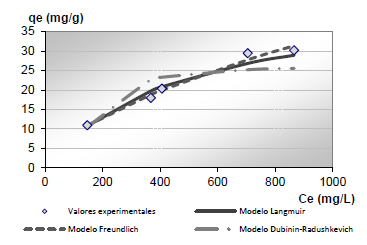 Las isotermas obtenidas a través de los tres modelos aplicados y los datos experimentales son presentados en la figura 1.