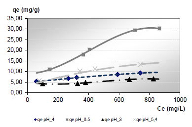 Para conocer el efecto del pH en la adsorción de níquel por la biomasa de Phyllanthus orbicularis, se realizó una serie de experimentos a tres valores de pH adicionales (3; 4 y 5,4).Las isotermas de adsorción obtenidas para cada uno de estos valores de pH se muestran comparativamente en la figura 2 y los parámetros obtenidos de la aplicación del modelo de Langmuir a estos resultados experimentales se presentan en la tabla 2.