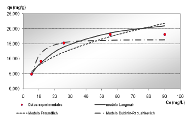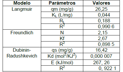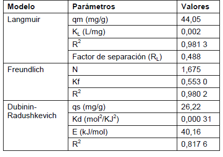 A pesar de que los modelos de isoterma aplicados no brindan información alguna sobre el mecanismo seguido por el sistema de adsorción, los parámetros obtenidos son útiles para describir al adsorbente utilizado y como elementos de comparación para establecer similitudes y diferencias [7].