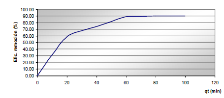 Los resultados muestran que el 60 % del níquel es adsorbido en los primeros 20 min, transcurriendo el proceso más lentamente hasta alcanzar los 60 min aproximadamente. A partir de este tiempo el sistema no adsorbe más níquel alcanzando el equilibrio, evidenciándose que un tiempo de contacto de 1 h es suficiente para lograr la máxima adsorción de níquel posible por Phyllanthus orbicularis (figura 4).