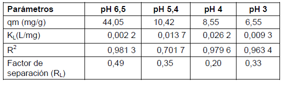 Basado en el modelo de Langmuir, puede calcularse una constante adimensional definida por Webber y Chakkravorti, [3] denominado factor de separación (RL) el cual está relacionado con la constante KL obtenida del modelo. Esta constante indica que la naturaleza de la adsorción puede ser desfavorable si RL>1, lineal si RL=1, favorable si 0<RL<1 e irreversibles en caso de que RL=0. Este valor de factor de separación obtenido para la biomasa de Phyllanthusorbicularis para cada uno de los valores de pH experimentados se muestra comparativamente en la tabla 2.