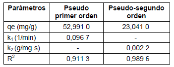 Para evaluar el mecanismo cinético del proceso de bioadsorción de níquel por la biomasa de Phyllanthus orbicularis, fueron aplicados a los datos experimentales los modelos para reacciones de pseudo-primer y pseudosegundo orden [5, 22]. Los valores de los parámetros obtenidos para ambos modelos son presentados en la tabla 4.