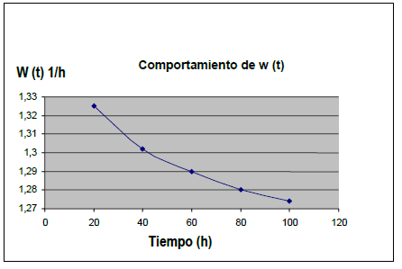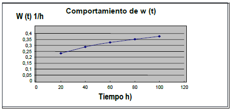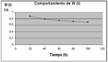 Los resultados de la tabla anterior muestran los problemas existentes en la fiabilidad operacional del área objeto de análisis y la figura 1 el comportamiento de la frecuencia media de fallos en el tiempo, la cual es decreciente en flujo no homogéneo de Poisson, pero con muy poca variación en el tiempo, denotando que ésta área es un punto débil o de conflicto sobre el que se debe trabajar para mejorar la efectividad del mantenimiento preventivo.