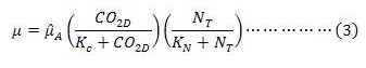 En condiciones donde exista la luz adecuada y las concentraciones necesarias de nitrógeno, el crecimiento de las algas estará limitado por la cantidad de carbono inorgánico disponible. Se conoce que la Chlorella sp., utiliza diferentes especies de carbono inorgánico como sustrato en función del pH, Descotere et al. (2013), Yan (2011) y Banks et al., (2003). Sin embargo, en este estudio se utiliza la concentración del dióxido de carbono disuelto como la especie química que determina la velocidad de crecimiento de las algas ya que demuestra, la disminución en el crecimiento de algas observado a pH alto, resultado del cambio en el equilibrio del ácido carbónico hacia más bicarbonato y carbonato y menor CO2.