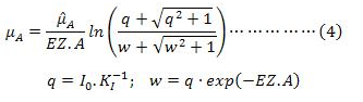 Con KI = 46 W.m-2 y es la constante de saturación de la luz. EZ = 0,7 l.g-1 es el producto del coeficiente de extinción y la profundidad del cultivo y A es la concentración de autótrofos (algas) en (g/L). Io, es la irradiación incidente sobre el cultivo (W.m-2), expresada como una función sinusoidal respecto al tiempo , donde T es la duración del período de iluminación en (h),