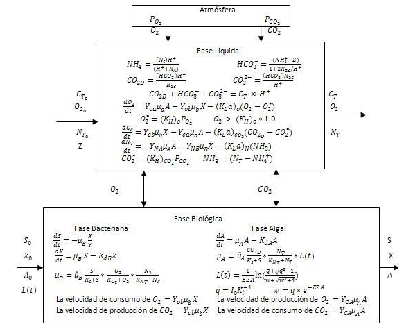 Un modelo dinámico de un sistema de crecimiento de algas-bacterias consiste en una serie de ecuaciones que describen las interrelaciones entre varias especies químicas y biológicas presentes. Para este propósito se considera un elemento de fluido pequeño, en el cual, las concentraciones de todas las especies presentes son uniformes. Es necesario examinar la cinética de crecimiento de las algas y bacterias, el equilibrio químico en el sistema y el balance de materias transportadas dentro y fuera del elemento de fluido escogido. Las ecuaciones resultantes se reflejan en la figura 1 y se discute con más detalles abajo.
