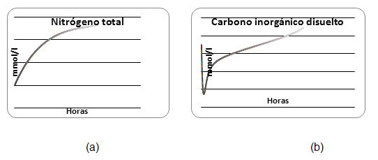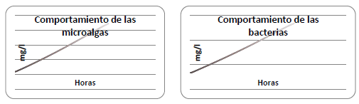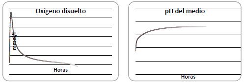 Después de las 7:00 h, el sustrato es consumido progresivamente y el pH aumenta, mientras que la actividad de las algas es dominante. Cuando la concentración del sustrato es alta en el punto de alimentación, es notable que el pH y oxígeno disuelto tiendan a disminuir.