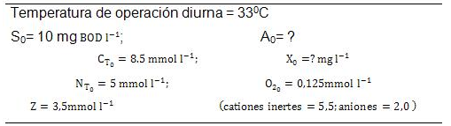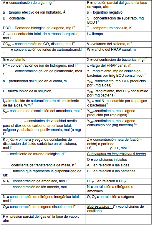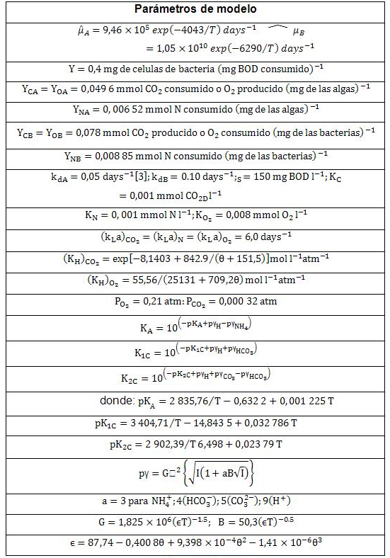 En este estudio, los fenómenos de nitrificación y desnitrificación, que se espera ocurran en el fotobiorreactor de capa fina, han sido descartados. La inclusión de estos fenómenos en el estudio sería más realista y daría lugar al surgimiento de pequeñas diferencias en las condiciones de operación con respecto a las reportadas aquí, tales como el ligero incremento de la demanda del oxígeno de la nitrificación durante el día, y la reducción en sustrato durante la desnitrificación en la noche., al igual que las variaciones mínimas en pH. Los parámetros usados en el modelo matemático son los que se presentan en la tabla 1.