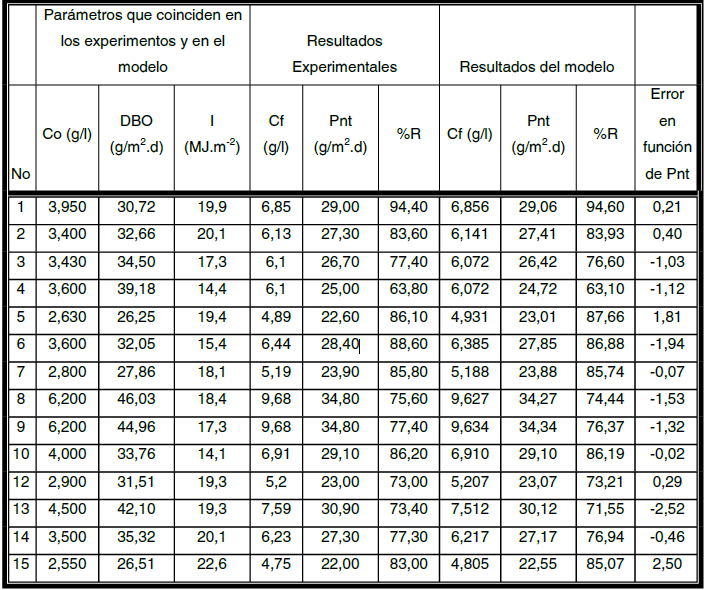 Las variaciones diurnas de productividad, remoción de materia orgánica, pH, el oxígeno disuelto y la temperatura en un fotobiorreactor de capa fina para el cultivo de algas bacterias en residuales líquidos porcinos han sido reportadas por Armas, E. y Alfaro O., et al., en 1993, quienes estudiaron un fotobiorreactor de capa fina construido en el cebadero porcino “El Brujo” en Santiago de Cuba. La calidad del modelo matemático puede ser evaluada, comparando sus predicciones teóricas con estos datos de comportamiento. En la tabla 2, se comparan los resultados del modelo con los reportados.