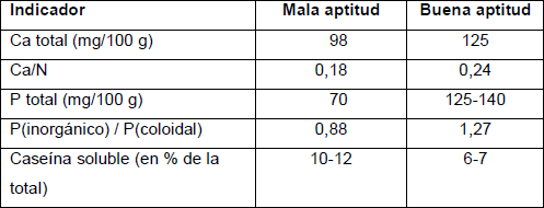 Se ha comprobado que la aptitud quesera es afectada por indicadores de calidad de la leche como la acidez [5], el recuento de células somáticas [4] y la concentración de caseínas, calcio y fósforo [2,3]. Los indicadores de composición de la leche que pueden utilizarse para evaluar la aptitud quesera son: calcio total, fósforo, caseína y la relación calcio/nitrógeno (Ca/N). Los valores correspondientes a esos indicadores según se reporta [6, 7] para leches de mala y buena aptitud quesera, se muestran en la tabla 1.