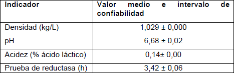 Los resultados de los indicadores evaluados de composición de la leche por queseras se sometieron a un análisis de varianza con p ≤ 0,05, se obtuvo que no existieron diferencias significativas entre las queseras. En la tabla 3 se presentan los resultados medios de los indicadores con su intervalo de confiabilidad (p ≤ 0,05) para la leche utilizada en la elaboración de queso fresco en esta zona.