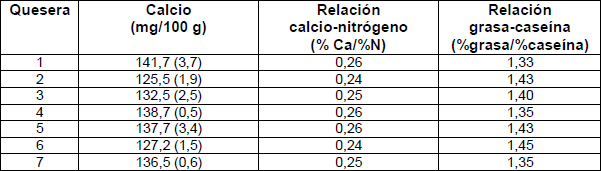 En la tabla 4 se presenta por queseras el contenido de calcio, la relación Ca/N y la de grasa/caseína. El contenido medio de calcio de la leche en todas las queseras fue superior a 125 mg/100 g de leche y en la relación Ca/N presentaron como mínimo valores de 0,24, lo que permite clasificarlas como leches de excelente aptitud quesera según lo reportado [6,7]. La relación grasa/caseína estuvo en el intervalo de 1,33 a 1,45, también relativamente alto, lo que se debe a que en las queseras artesanales no se estandariza la grasa y se trabaja con leche entera.