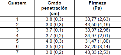 En la tabla 5 se reflejan los resultados de la medición del grado de penetración en la cuajada, así como de la firmeza, en el momento de corte decidido por los respectivos queseros. Estos valores de firmeza son bastante bajos si se comparan con los reportados para quesos de pasta blanda, pero son cercanos a los de quesos duros [16].