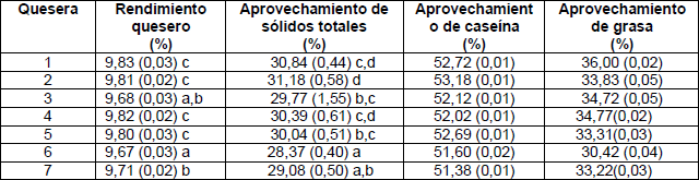 En la tabla 6 se reportan los resultados medios de los indicadores de eficiencia tecnológica por cada quesera. El rendimiento quesero presentó diferencias significativas entre queseras y fue bajo; mucho más al comparar con lo publicado para el queso blanco campesino colombiano, también fresco y artesanal, con rendimientos entre 11,62 y 13 % [4,32].