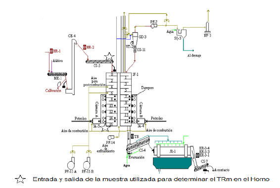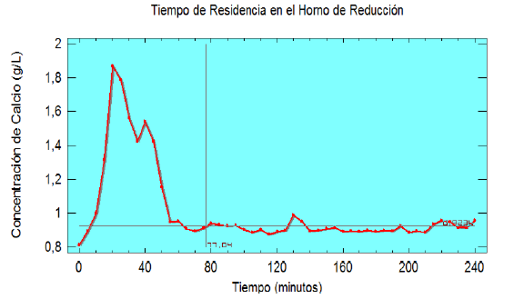 Para la determinación del tiempo de residencia se emplea regularmente como trazador hidróxido de calcio, previamente molido y tamizado hasta lograr una granulometría apropiada. El hidróxido de calcio Ca(OH)2 se mezcla con una masa de mineral reducido con una proporción de 2:1 (12 kg de mineral reducido por 6 kg de Ca(OH)2), y se añade directamente al sinfín que alimenta al hogar H-0 (mostrado por la estrella en la parte superior de la figura 1) mientras que el horno se encuentre en operación procesando un flujo de mineral que puede encontrarse en el rango de (625 a 917) kg/h de manera estable. Luego de añadir el trazador al horno se comienzan a tomar muestras cada cinco minutos en el último hogar del horno (mostrado por la estrella en la parte inferior de la figura 1) durante un período de cuatro horas. Las muestras tomadas cada cinco minutos, de un peso aproximado de 30 g, se dejan enfriar depositándolas directamente en tomas de muestras metálicos, previamente codificados. Cuando las muestran alcanzan la temperatura ambiente se transfieren a un sobre (codificándolo con el número del código de la muestra, la fecha y la hora), y se envían al laboratorio analítico para determinar la concentración de calcio presente en las mismas. Luego de tener los valores de concentraciones de calcio (gramos por litros), se grafican en función del tiempo y se procede a determinar el Tiempo de residencia medio (TR.) por la ecuación 1, siguiendo la metodología presentada por la tabla 1.