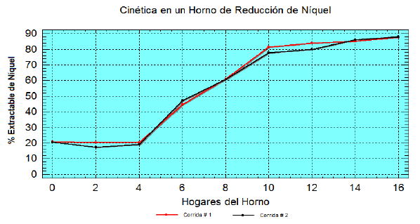 También puede apreciarse como el mineral laterítico que entra en el horno de reducción cae casi en su totalidad al hogar 16 en los primeros cincuenta minutos, siendo una de las razones por la que en este tipo de equipos los poercentaje de extractables, muchas veces, no alcanzan valores superiores al 88 %.