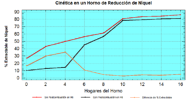 En ella puede apreciarse como el aire de postcombustión en el hogar H-6 influye negativamente en el porcentaje de extractable que puede ser obtenido en un horno de solera múltiple, existiendo la mayor diferencia en la zona comprendida por los hogares H-0 hasta H-6, que es la región donde la atmósfera reductora recibe una dilución por la entrada del aire al sistema. También puede observarse, como con la aplicación del aire de postcombustión, se pierde alrededor de un 4 % de extractable de níquel, lo que equivale a dejar de ingresar en el país una suma considerable de USD/año.
