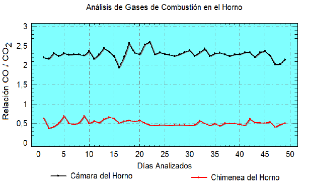 En la figura 5 se muestra la relación volumétrica que existe entre el monóxido de carbono y el dióxido de carbono, determinados por el análisis de Orsat en un período de 49 días, tomados en la chimenea y la cámara del horno.