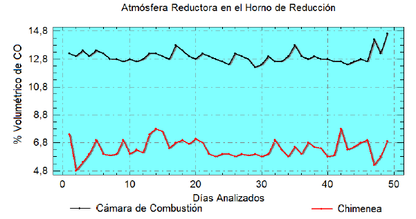 En ella puede apreciarse como en la cámara del horno la relación volumétrica entre el CO y el CO. osciló con valores entre 2 y 2,5, mientras que en la chimenea se encontraba con valores entre 0,4 y 0,7. Este comportamiento es lógico, ya que muestra la disminución que sufre la atmósfera reductora del horno a medida que reacciona con el mineral laterítico en forma de óxido. La misma permite identificar que este tipo de hornos utiliza combustión incompleta, hecho que puede corroborarse por presentar valores elevados de CO en todo el equipo (valores de % volumétricos que oscilaron entre 12,5 y 14,6 en las cámaras del horno, y valores 4,8 a 7,8 en la chimenea del equipo). En la figura 6 se presenta el comportamiento presentado por el CO dentro del horno de reducción a escala de planta piloto durante el período de días evaluados en las cámaras y en la chimenea del reactor.