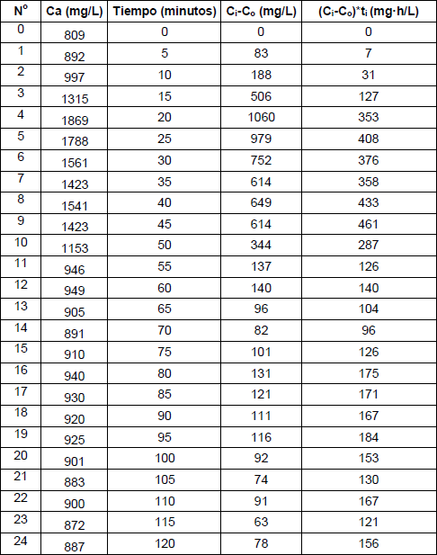 Ci-Co: Diferencia entre las concentraciones de calcio tomadas en el tiempo señalado y la concentración de calcio que presentaba el mineral laterítico.