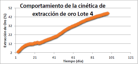 La figura 1 exhibe el comportamiento de la cinética de extracción de oro que mostró el lote 4, con una lixiviación por sectores de 97 días y una recuperación de oro de 46,14 %.