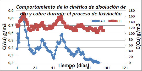 A continuación se presenta la figura 2 que muestra el comportamiento de la cinética de disolución de oro y cobre durante el proceso de lixiviación.