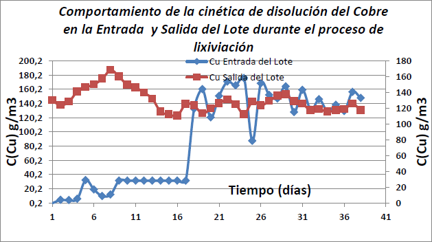 Como muestra la figura 3 en los primeros 18 días de haber inyectado al proceso una solución fresca de cianuro (SI) para efectuar la lixiviación se observa valores de cobre de hasta 35 g/m3 y después de pasado este tiempo donde esta solución es la que se ajusta y se recircula para la irrigación se observa el incremento notable de las concentraciones de cobre estando aproximadamente desde 100 a 160 g/m3 debido a la cinética de disolución del cobre con el cianuro.