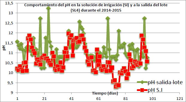 Los datos experimentales del proceso de lixiviación (tiempo efectivo, volumen de solución alimentada y de salida del lote, flujo alimentado y de salida del lote, concentraciones de Au, Cu y NaCN en la entrada y salida del lote, kg de Au, Cu y NaCN en la entrada y salida del lote, pH de la solución de irrigación, pH de la salida del lote, recuperación de Au y Cu y consumo kg NaCN/t) fueron analizados en el periodo del 24 de diciembre de 2014 al 30 de marzo de 2015.