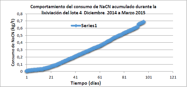 La figura 6 muestra el comportamiento del consumo de NaCN acumulado durante la lixiviación del lote 4 en el periodo de diciembre 2014 a marzo 2015, que fue de 0,69 kg/t mineral, tal y como lo exhiben los datos que se reflejan a continuación.